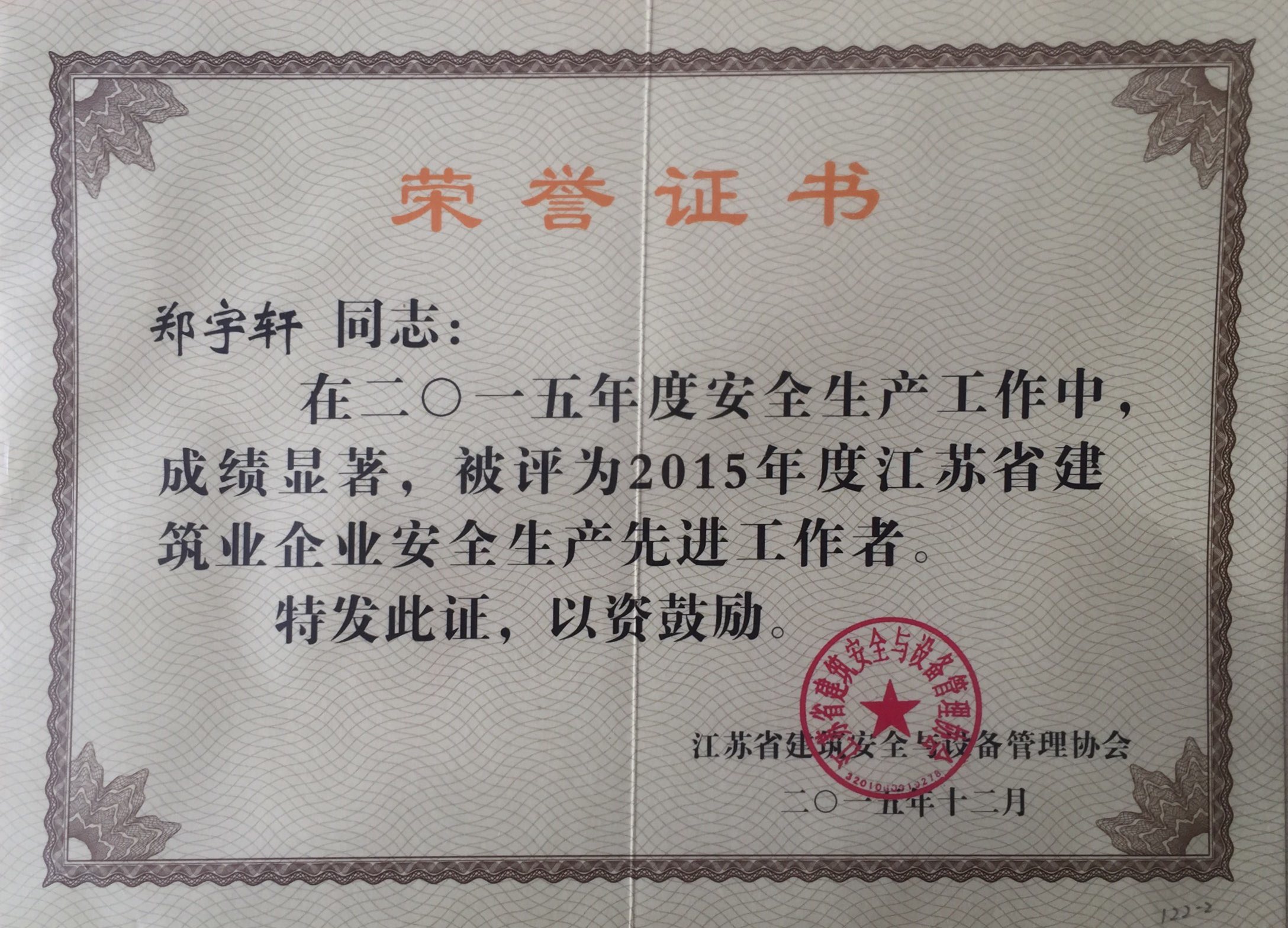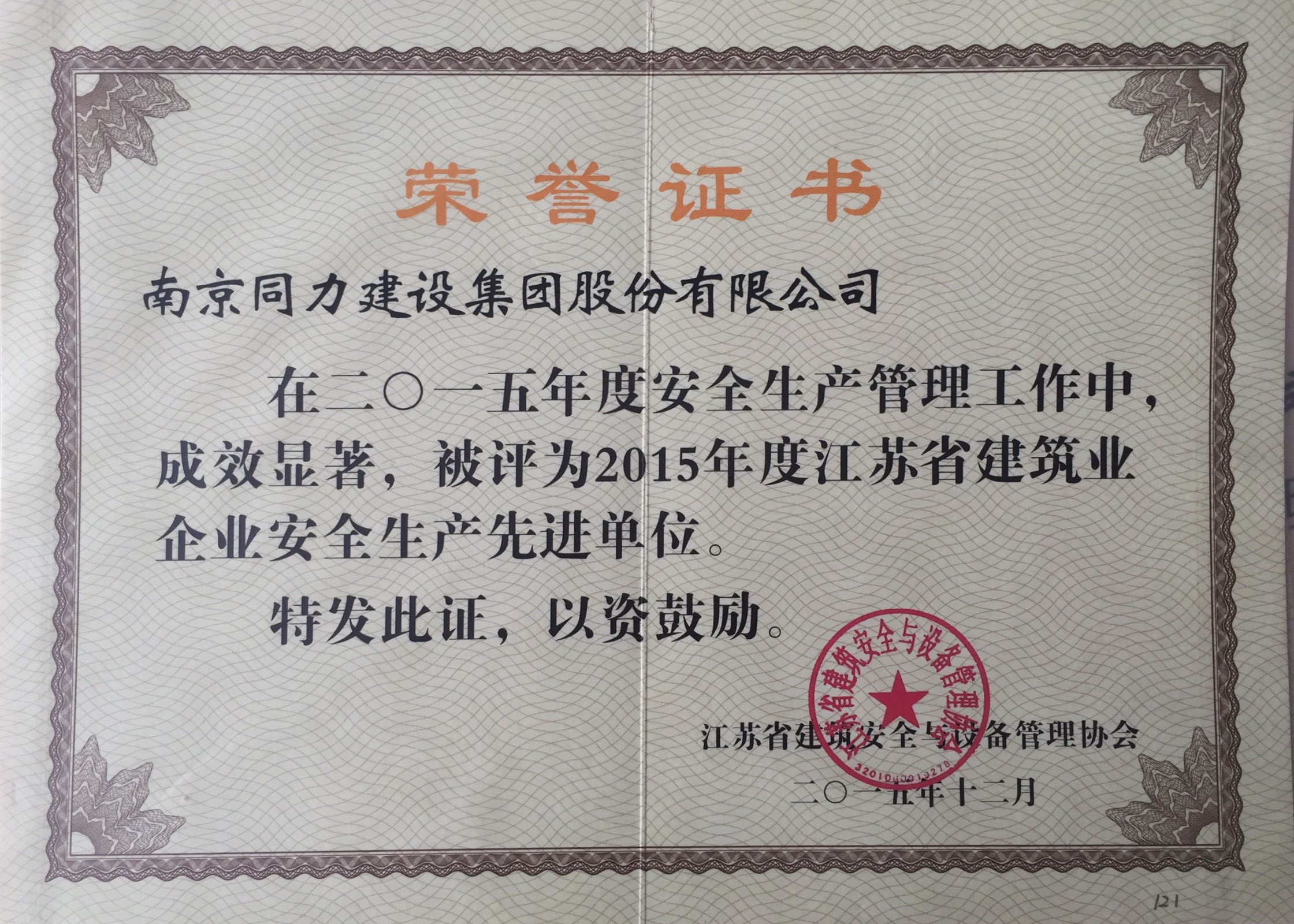 公司被評(píng)為2015年度江蘇省建筑業(yè)企業(yè)安...