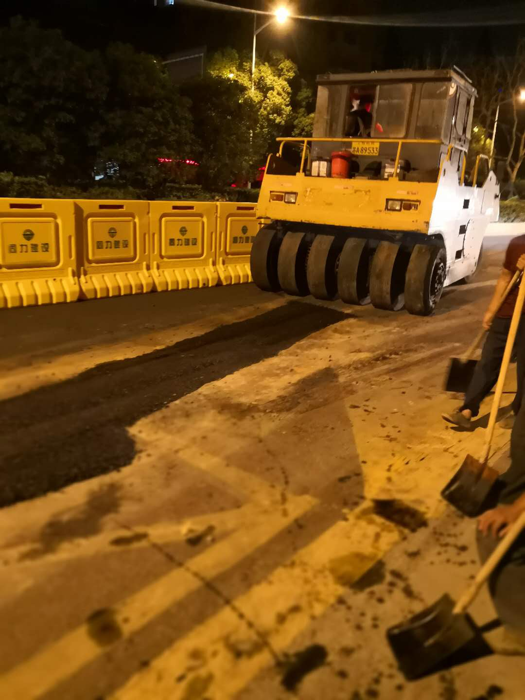 龍?bào)粗新氛沃凶畲箅y點(diǎn)在于承載交通壓力大,施工時(shí)間受很大約束。首先是每日的工作時(shí)間較短,雖前期做了大量溝通工作,但鑒于龍?bào)粗新肥浅鞘心媳毕蚪煌ù髣?dòng)脈,施工容易造成嚴(yán)重?fù)矶?。故最終只能在每日夜間21:00至次日凌晨6:00于進(jìn)行施工,其余時(shí)段均需保證全時(shí)段無(wú)占用通行。在復(fù)雜不利的環(huán)境下,緊抓“定時(shí)清場(chǎng)法”、施“單元施工法”不放松,將整條道大路劃分為十六個(gè)單元以便組織推業(yè)進(jìn)。每日夜間21:00圍擋設(shè)施、施工車輛等陸續(xù)進(jìn)場(chǎng),大批施工人員和交通疏導(dǎo)人員在各個(gè)單元就位,然后根據(jù)現(xiàn)場(chǎng)車流量情況試用圍擋封閉部分車道,并根據(jù)測(cè)試圍擋后車流通行效果靈活調(diào)整車道封閉時(shí)間以及車道封閉數(shù)量,在確認(rèn)不會(huì)造成交通堵塞之后再圍擋施工。見縫插針、統(tǒng)籌協(xié)調(diào)、調(diào)整工設(shè)序,努力做到化難點(diǎn)為亮點(diǎn)。為了確保白天可以順利開放交通,提前擬定方案,將小面積難以壓實(shí)、大面積難以養(yǎng)生的水泥穩(wěn)定碎石道路基層處理方案,調(diào)整為小面積用砼澆筑覆蓋鋼板養(yǎng)護(hù)、大面積病害采用ATB瀝青碎石即壓即成型的方案,既保障了交通也保證了質(zhì)量。同時(shí)部署各單元作業(yè)班組集中力量在少量點(diǎn)位內(nèi)施工,開一段干一段收一段,不多開作業(yè)面,便于控制質(zhì)量和進(jìn)度,同時(shí)方便組織圍擋、開放交通及白天的維護(hù)巡查;對(duì)于過(guò)路溝槽、病害處理的鋼板覆蓋措施,也有多項(xiàng)要求及改進(jìn)。首先是確保鋼板厚度不低于2厘米,并在鋼板下放置橡膠墊,減少車輛碾壓的噪音,鋼板四周還會(huì)設(shè)置減速帶起到警示過(guò)往車輛減速以及避免鋼板發(fā)生位移,其次是對(duì)于鋼板下脫全跨度大于1米的增設(shè)槽鋼支撐,并做到24小時(shí)人員巡視不間斷。與此同時(shí),周邊一些單位比較支持,騰出了一些空地給我們堆放材料,這樣在每天早上6點(diǎn)能確保圍擋和施工車輛等就近安放,恢復(fù)快車道交通。