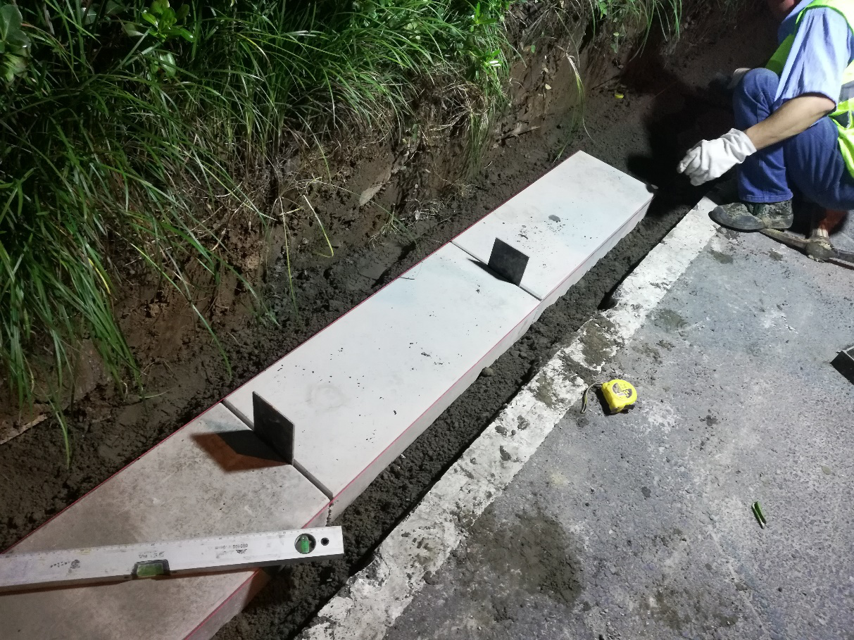 以路緣石縫隙為例,為了確保側(cè)平石的縫寬一致,外觀美觀,本次設(shè)計(jì)對(duì)側(cè)平石的縫寬都提了具體的要求:分別是側(cè)石縫寬2毫米,平石縫寬5毫米。為了保證作業(yè)班組能嚴(yán)格達(dá)到這個(gè)要求,項(xiàng)目部要求作業(yè)班組定制卡尺進(jìn)行施工控制?,F(xiàn)場(chǎng)實(shí)施中5毫米的卡尺因厚度剛度足夠,能順利使用;但2毫米的卡尺卻因?yàn)樘∪菀鬃冃?。這個(gè)難題如何解決?在現(xiàn)場(chǎng)研究后,發(fā)現(xiàn)花治崗巖材料的打包帶厚度剛好是2毫米,于是作業(yè)班組采用剪短的折打包帶作為卡尺,既方便有效,還起到變廢為寶的效果。